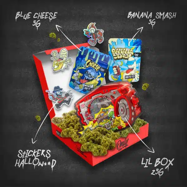 💥 Blue Cheese 5G – Aromas intensos y un clásico irresistible. 🍌 Banana Smash 5G – Dulce, potente y con el toque tropical que necesitas. 🧰Lil Box 25G – Nuestra caja mini más vendida, repleta de variedad y sorpresas. 👻 Sticker edición Halloween – Exclusivo y coleccionable, solo disponible en este pack.